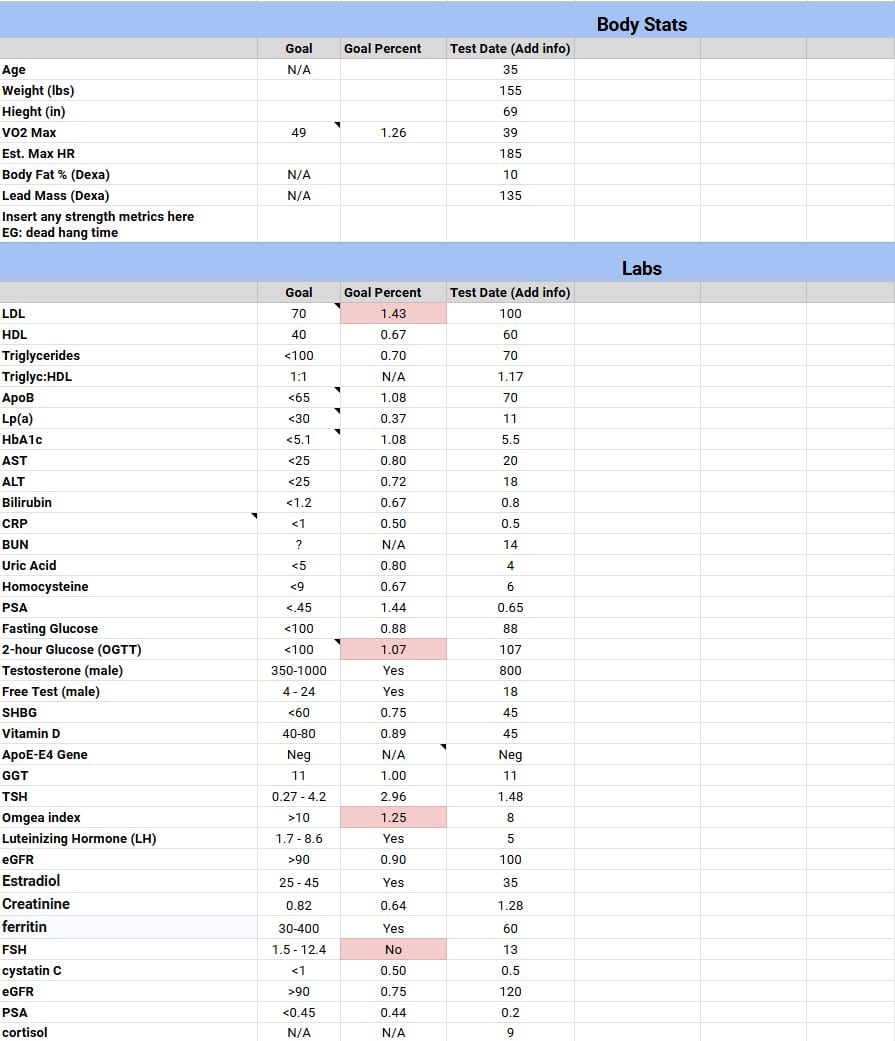 To make it easier for you to interpret your results, I’ve created a FREE Google Sheet where you can input your blood test data and compare it to Peter’s ideal values.